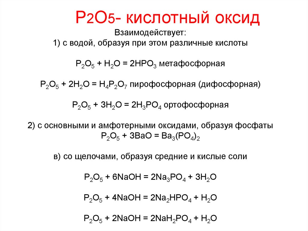 Р2О5 + ЗН2О = 2H3PO4 ортофосфорная