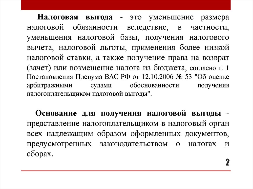 Налоговая выгода - это уменьшение размераналоговой обязанности вследствие, в частности,