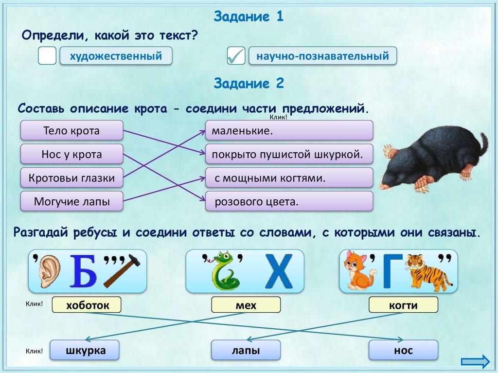 Составь описание крота - соедини части предложений.