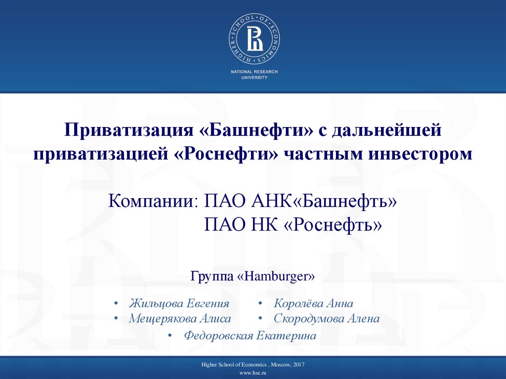 1. Приватизация «Башнефти» с дальнейшей приватизацией «Роснефти» частным инвестором Компании: ПАО АНК«Башнефть» ПАО НК «Роснефть»