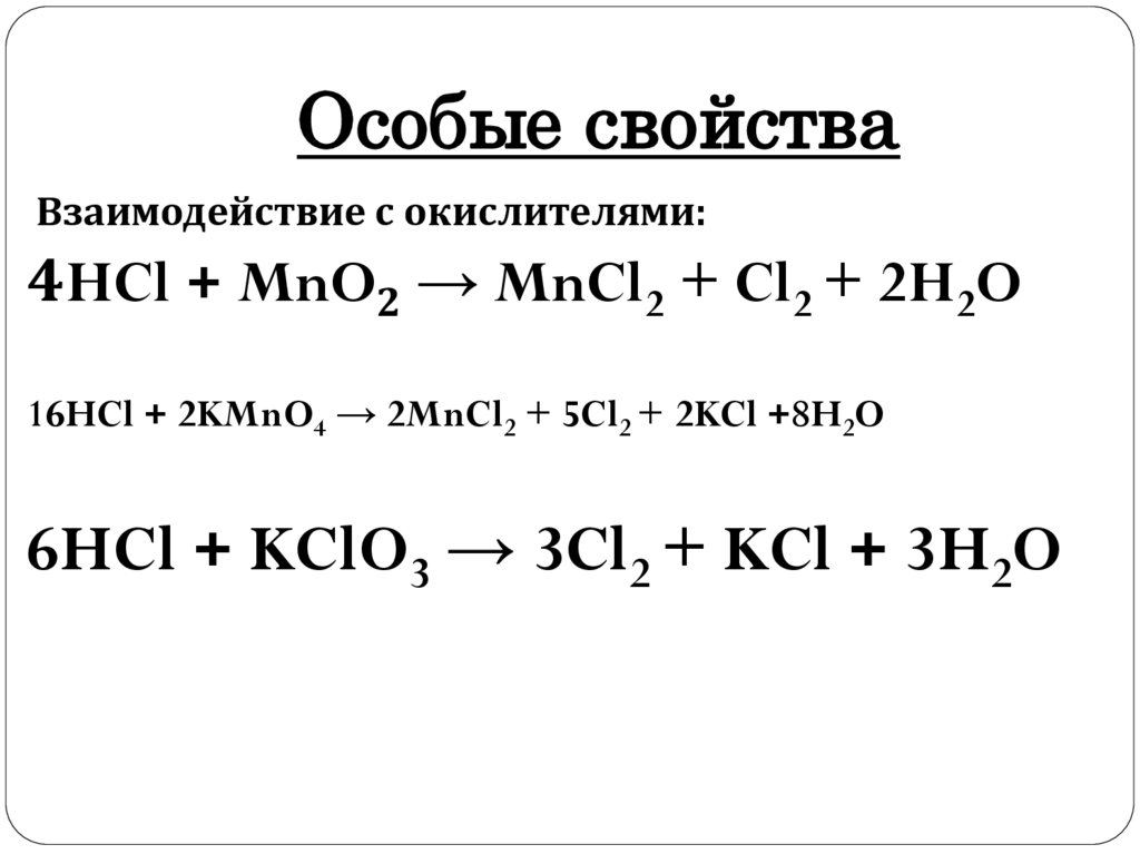 16HCl + 2KMnO4 → 2MnCl2 + 5Cl2 + 2KCl +8H2O