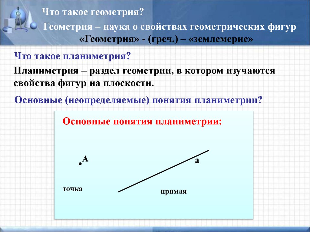 Что такое геометрия?Геометрия – наука о свойствах геометрических фигур