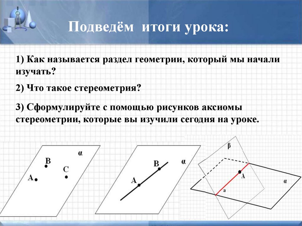 Подведём итоги урока:1) Как называется раздел геометрии, который мы начали