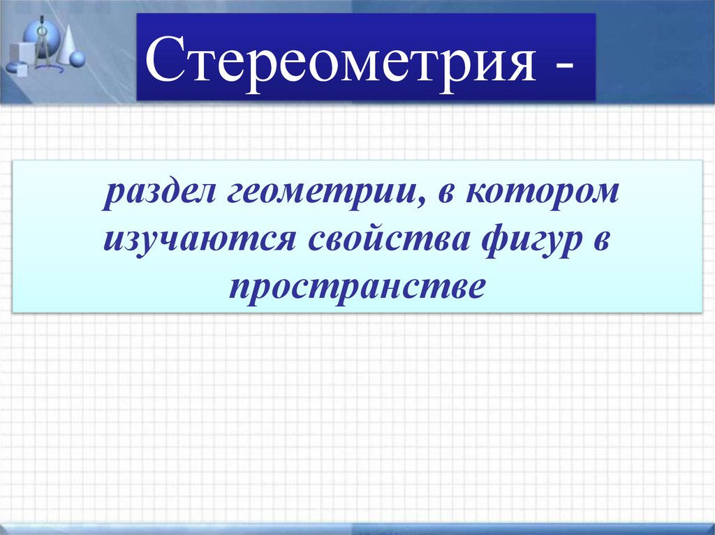 Стереометрия раздел геометрии, в которомизучаются свойства фигур в