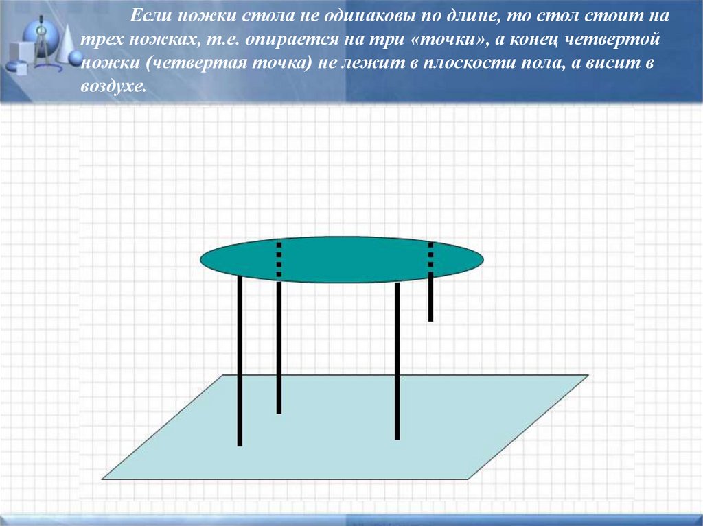 Если ножки стола не одинаковы по длине, то стол стоит натрех ножках, т.е. опирается на три «точки», а конец четвертой
