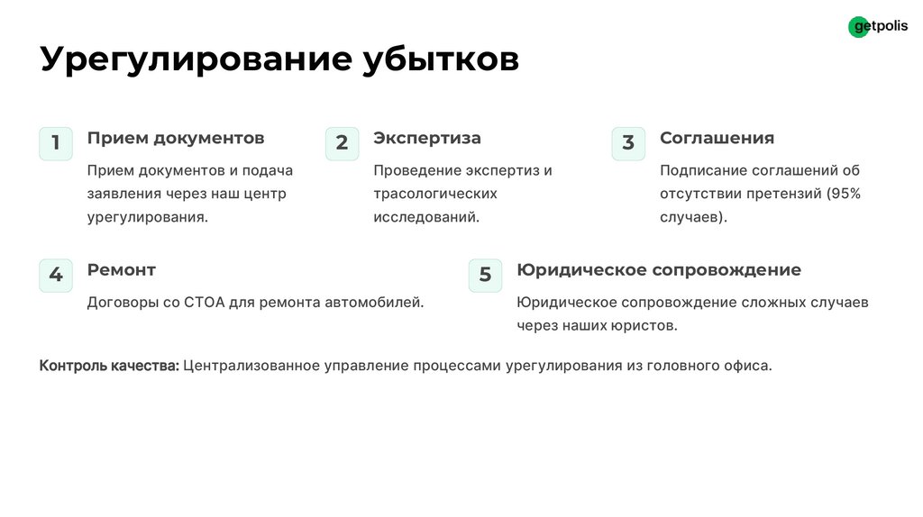 Контроль качества: Централизованное управление процессами урегулирования из головного офиса.