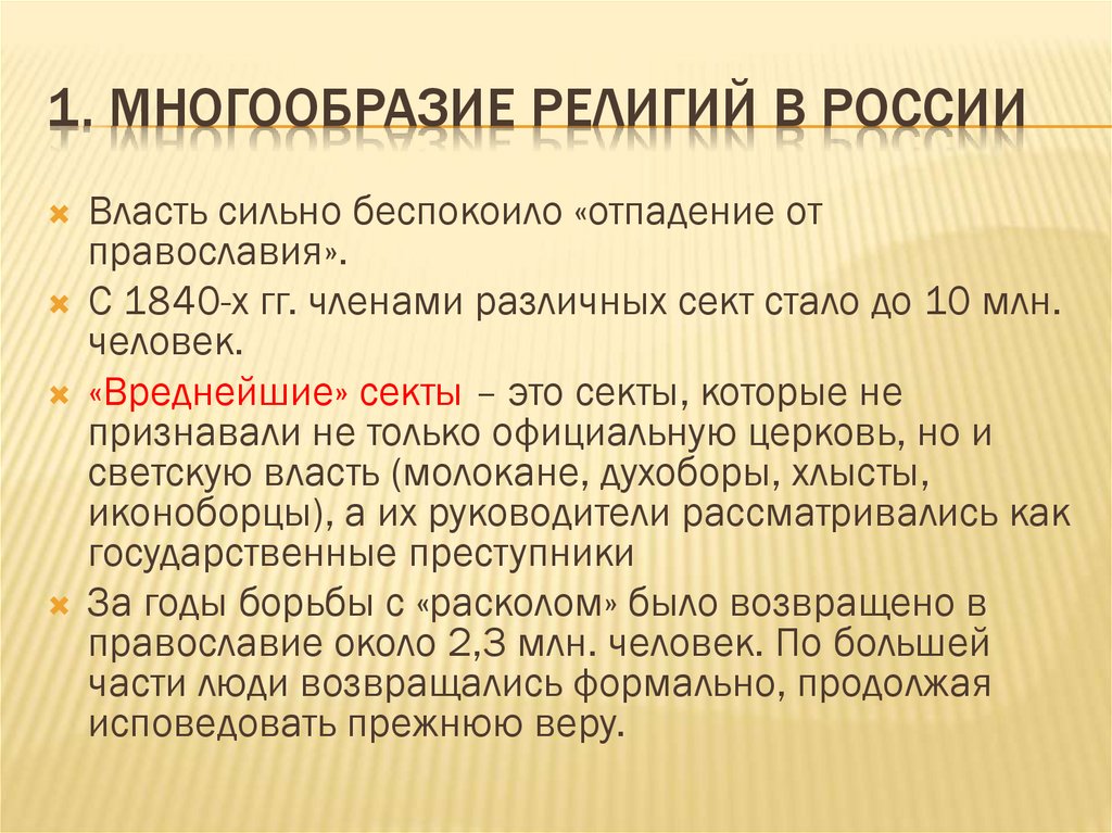 1. МНОГООБРАЗИЕ РЕЛИГИЙ В РОССИИВласть сильно беспокоило «отпадение от