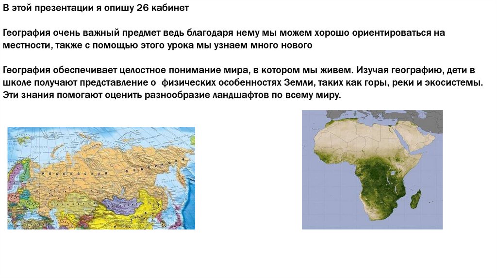 В этой презентации я опишу 26 кабинетГеография очень важный предмет ведь благодаря нему мы можем хорошо ориентироваться на