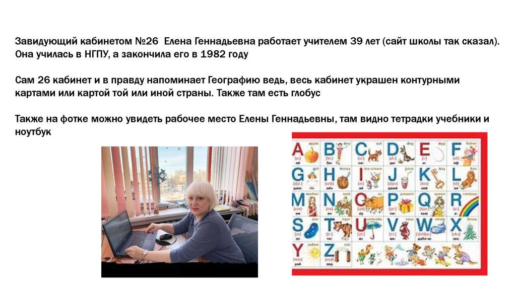 Завидующий кабинетом №26 Елена Геннадьевна работает учителем 39 лет (сайт школы так сказал).Она училась в НГПУ, а закончила его в 1982 году