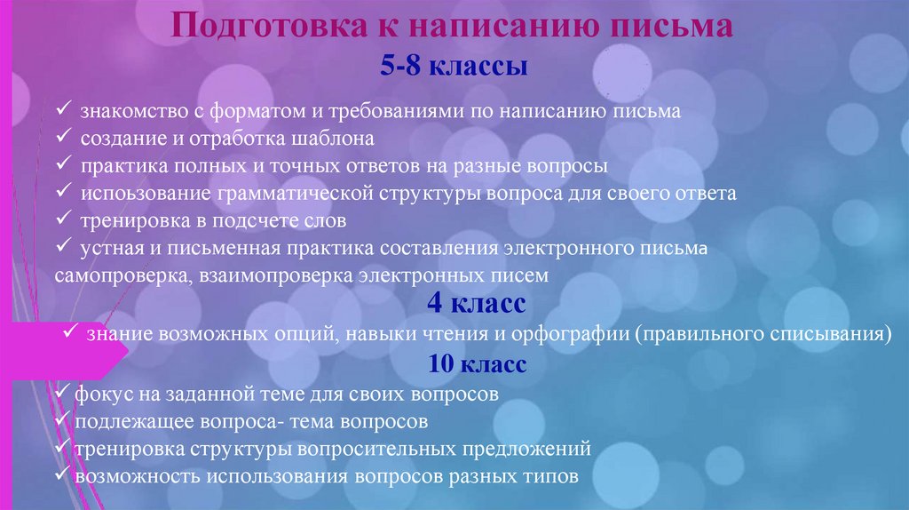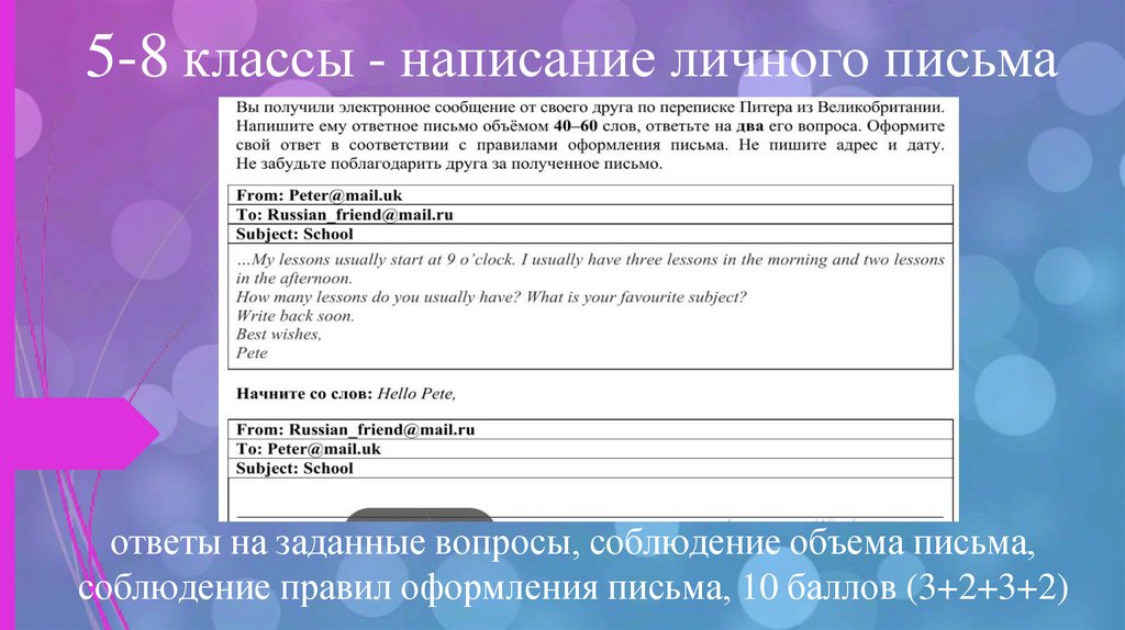 5-8 классы - написание личного письмаответы на заданные вопросы, соблюдение объема письма,