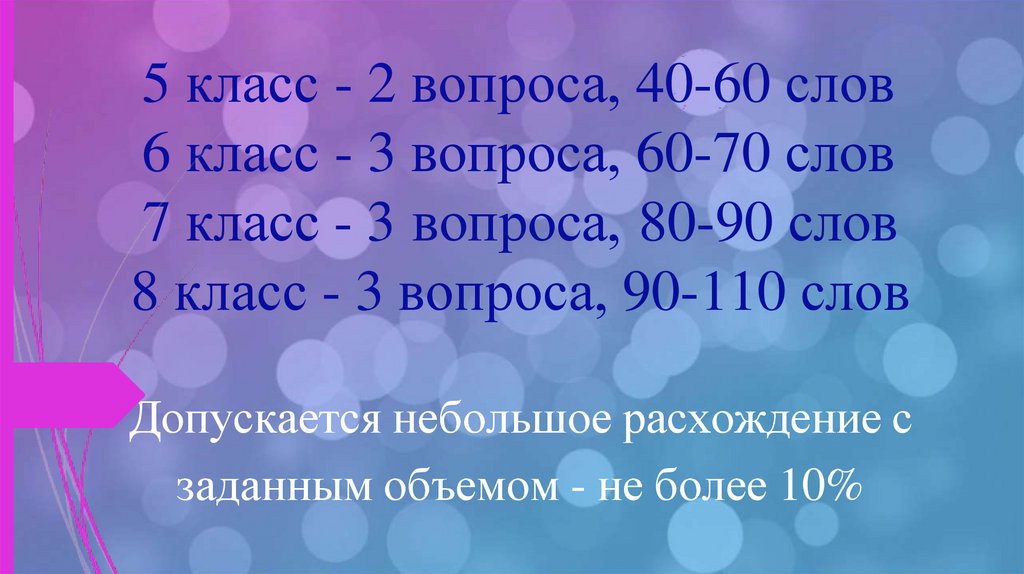 5 класс - 2 вопроса, 40-60 слов6 класс - 3 вопроса, 60-70 слов