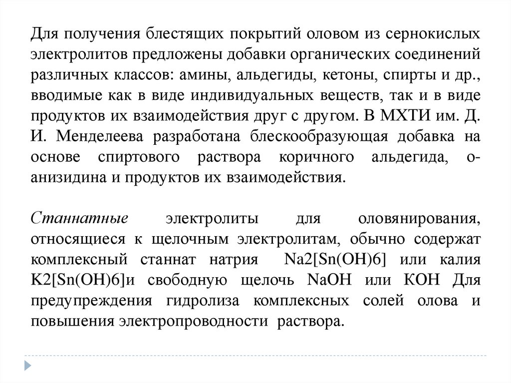 Для получения блестящих покрытий оловом из сернокислыхэлектролитов предложены добавки органических соединений