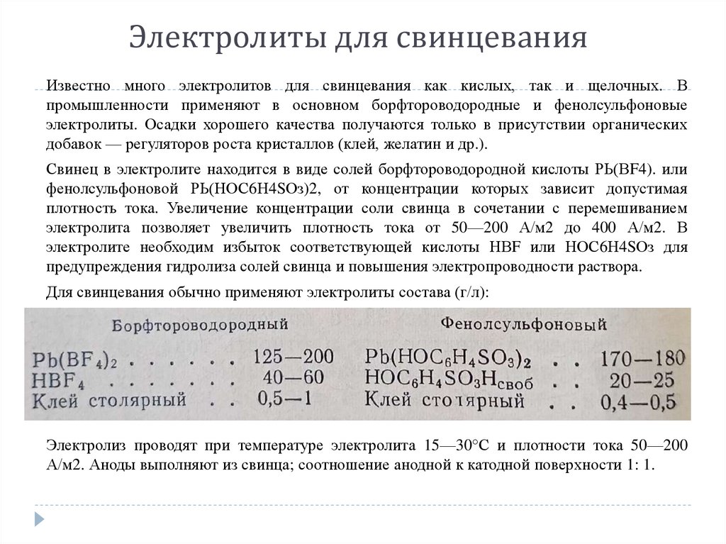 Для свинцевания обычно применяют электролиты состава (г/л):