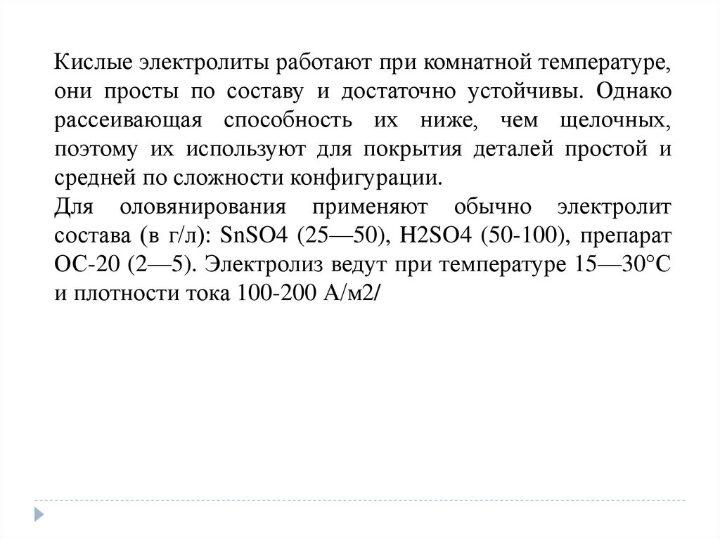 Кислые электролиты работают при комнатной температуре,они просты по составу и достаточно устойчивы. Однако