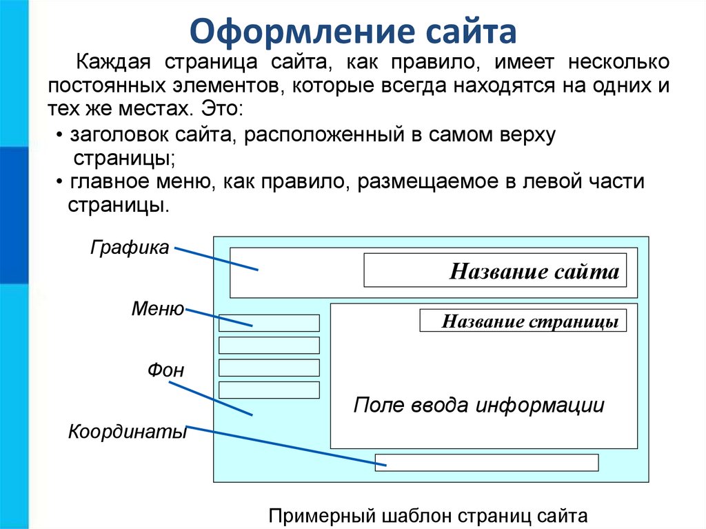 Оформление сайтаКаждая страница сайта, как правило, имеет несколько