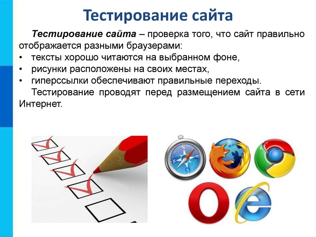Тестирование сайтаТестирование сайта – проверка того, что сайт правильно