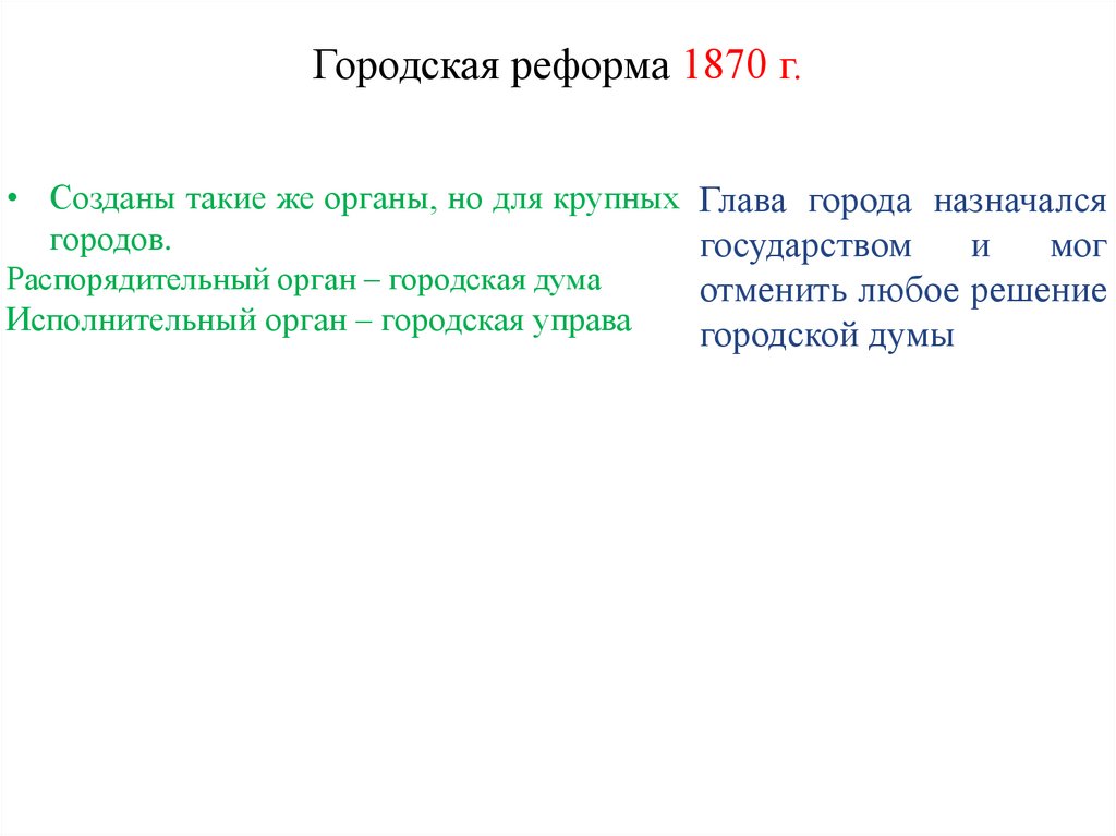 Городская реформа 1870 г.• Созданы такие же органы, но для крупных Глава города назначался