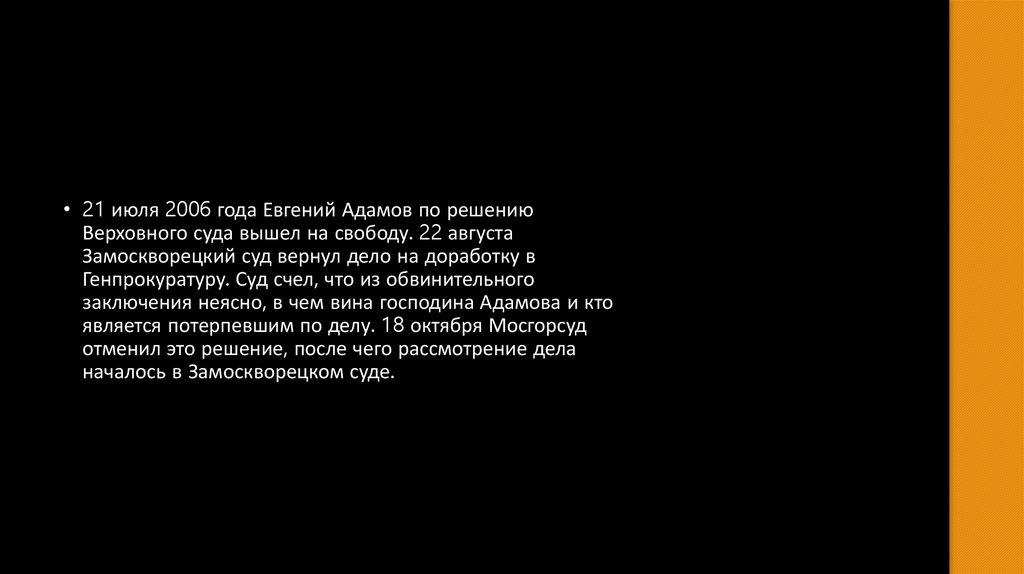 • 21 июля 2006 года Евгений Адамов по решениюВерховного суда вышел на свободу. 22 августа