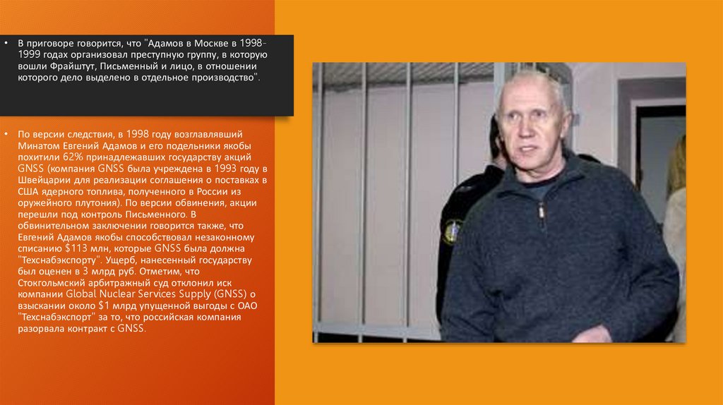 • В приговоре говорится, что "Адамов в Москве в 19981999 годах организовал преступную группу, в которуювошли Фрайштут, Письменный и лицо, в отношении