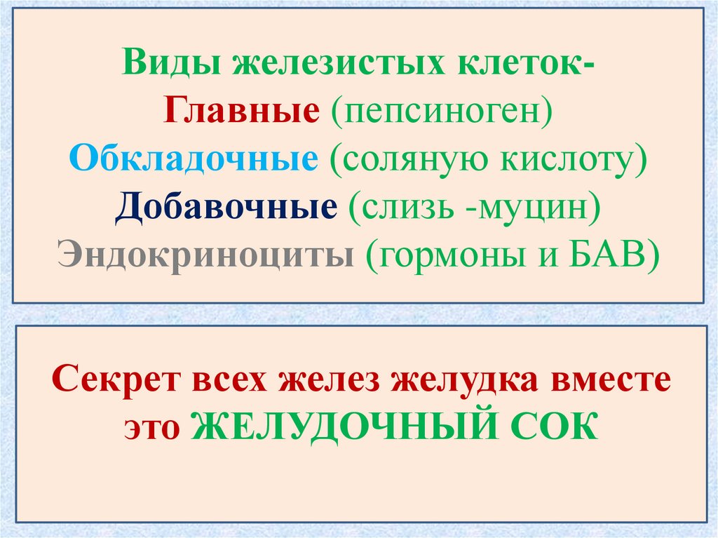 Виды железистых клетокГлавные (пепсиноген)Обкладочные (соляную кислоту)