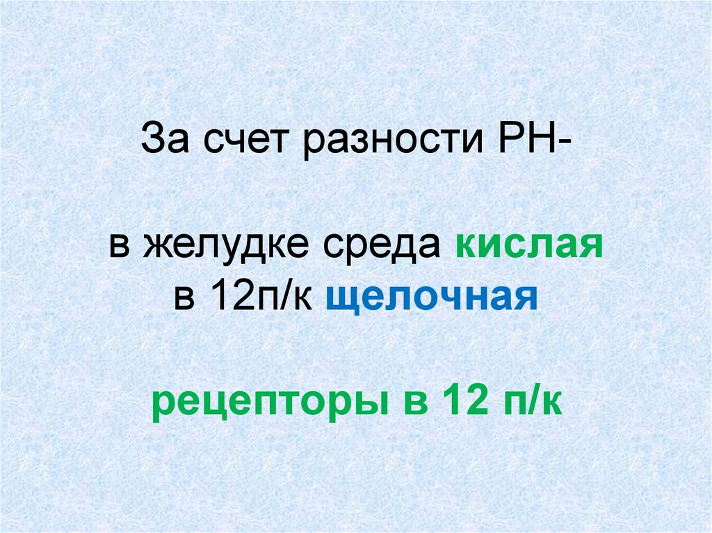 За счет разности PHв желудке среда кислаяв 12п/к щелочная