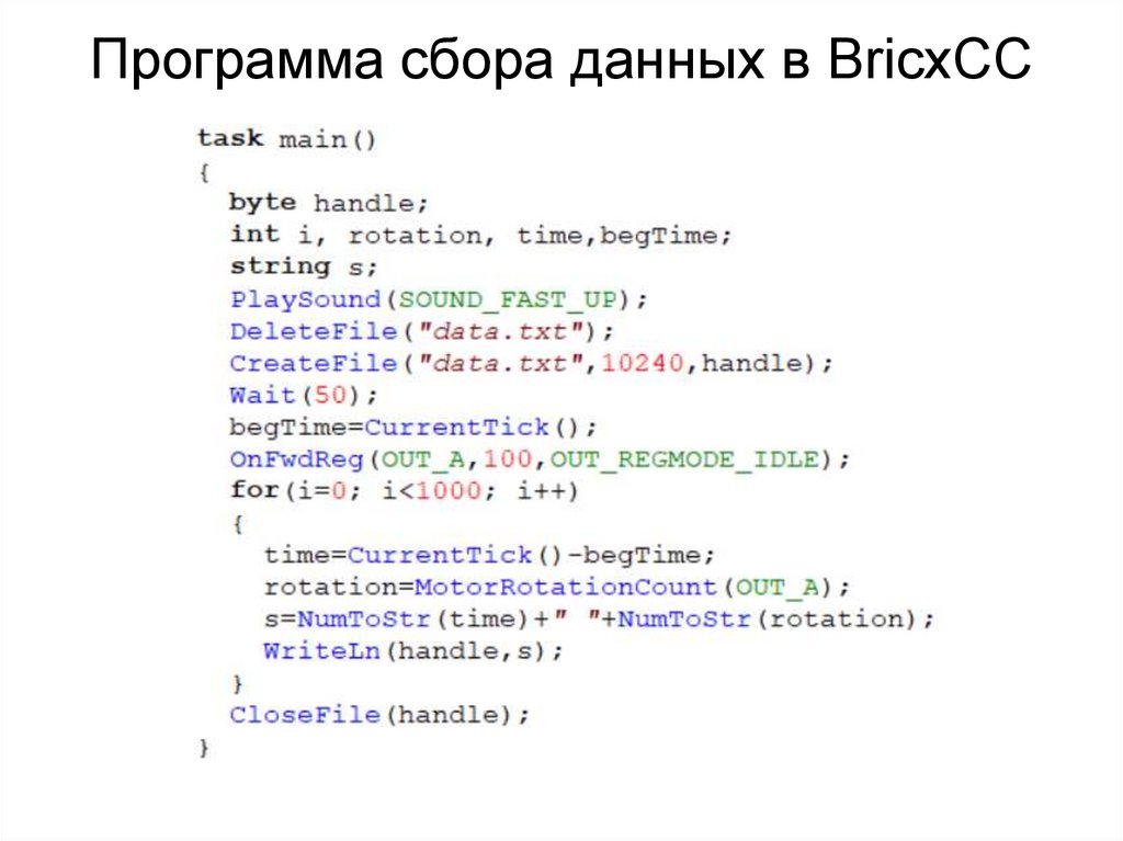 1. С помощью среды Bricx Command Center создайте программу длярегистрации данных энкодера у двигателя NXT при его включении на