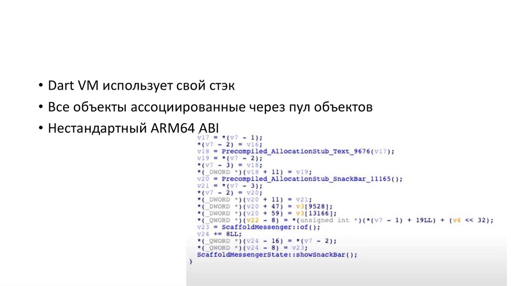 • Dart VM использует свой стэк• Все объекты ассоциированные через пул объектов