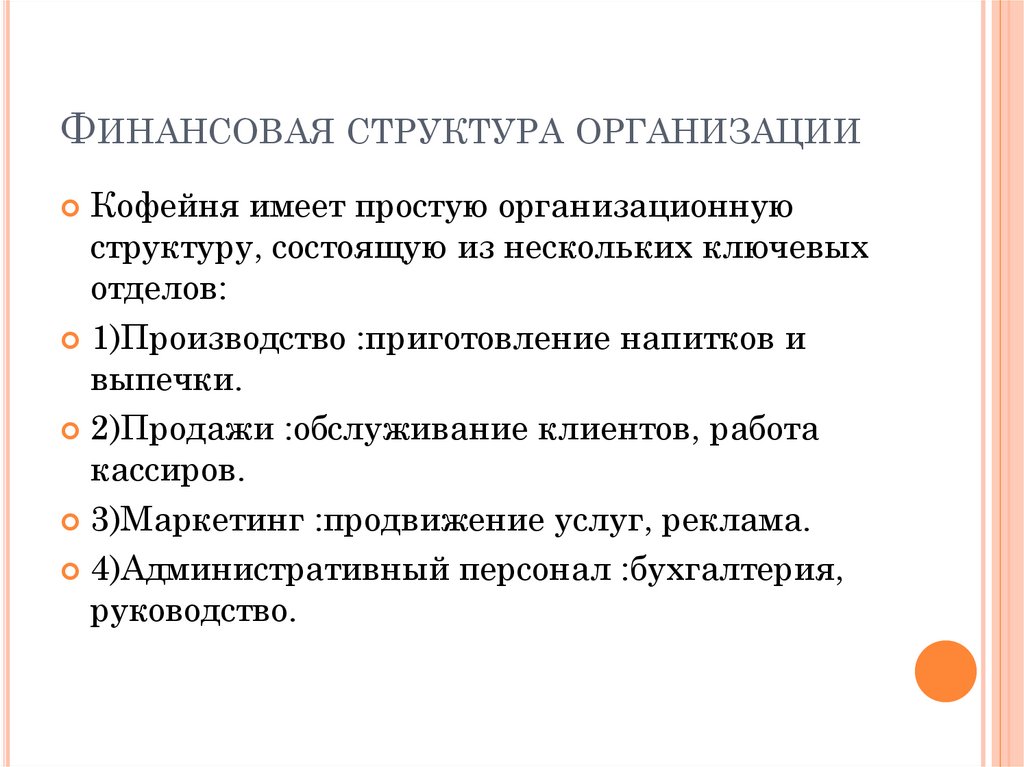 ФИНАНСОВАЯ СТРУКТУРА ОРГАНИЗАЦИИКофейня имеет простую организационную