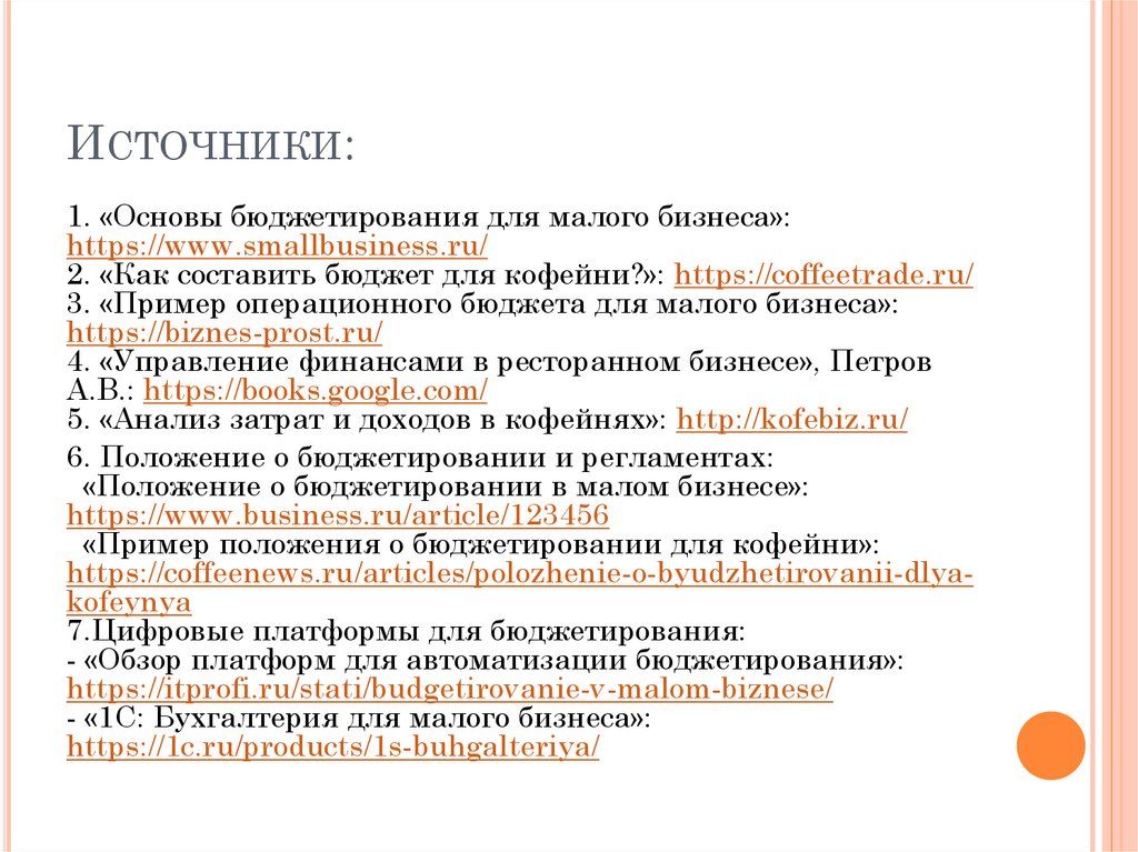 ИСТОЧНИКИ:1. «Основы бюджетирования для малого бизнеса»: