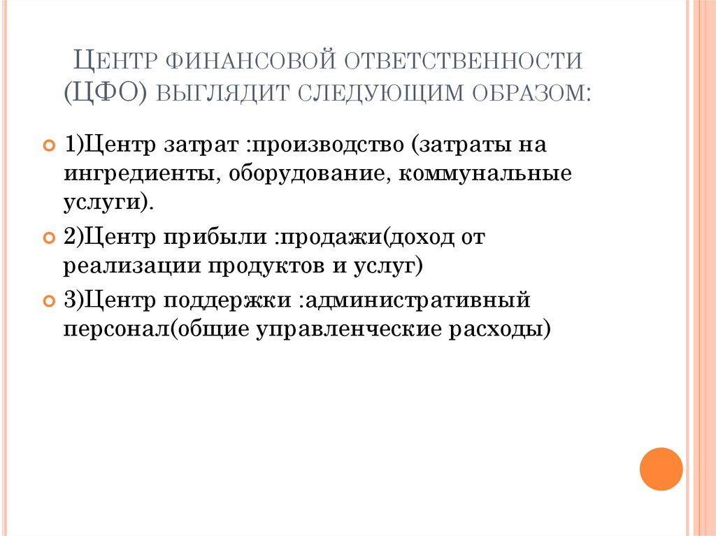ЦЕНТР ФИНАНСОВОЙ ОТВЕТСТВЕННОСТИ(ЦФО) ВЫГЛЯДИТ СЛЕДУЮЩИМ ОБРАЗОМ: