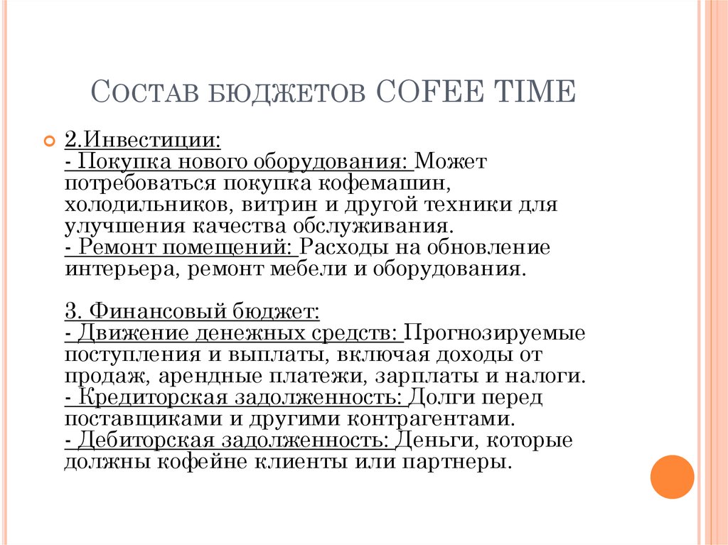 СОСТАВ БЮДЖЕТОВ COFEE TIME2.Инвестиции: