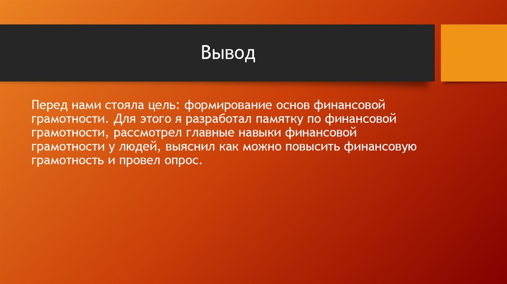 ВыводПеред нами стояла цель: формирование основ финансовой
