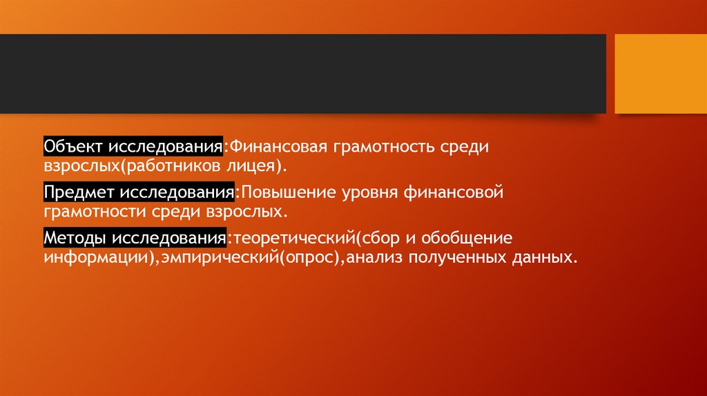 Объект исследования:Финансовая грамотность средивзрослых(работников лицея).