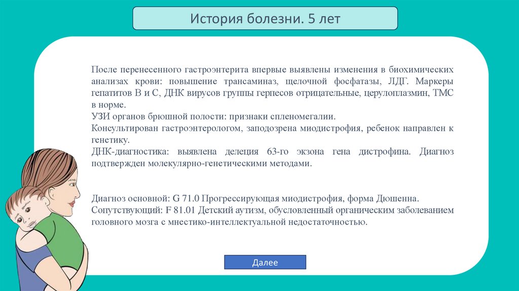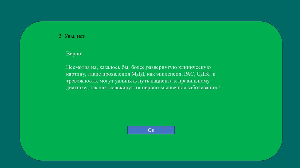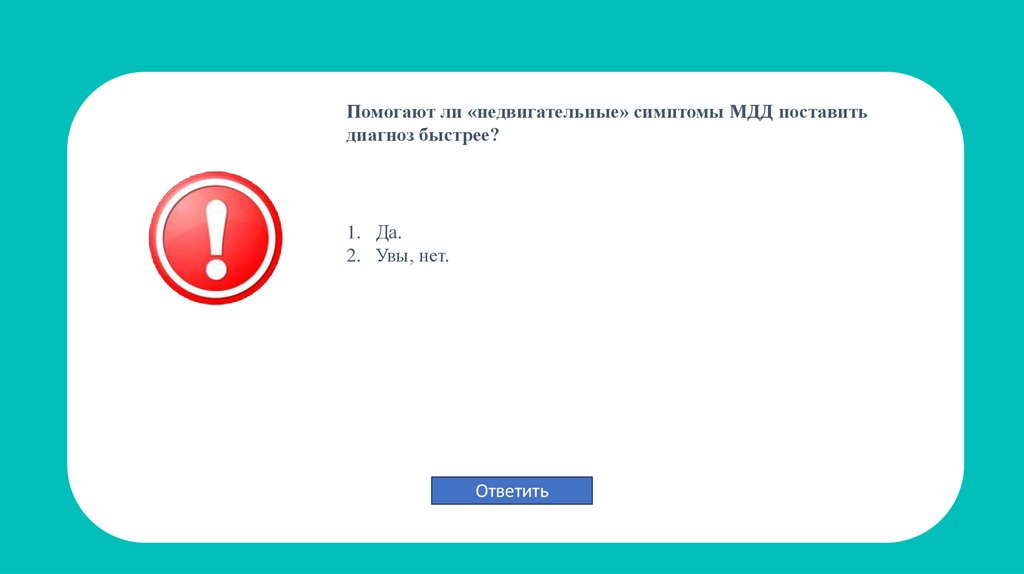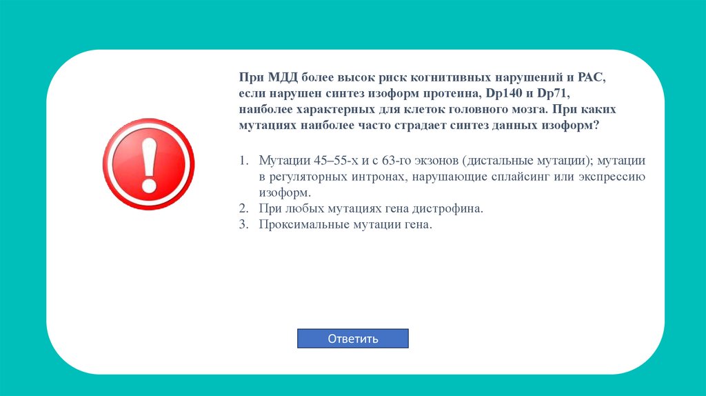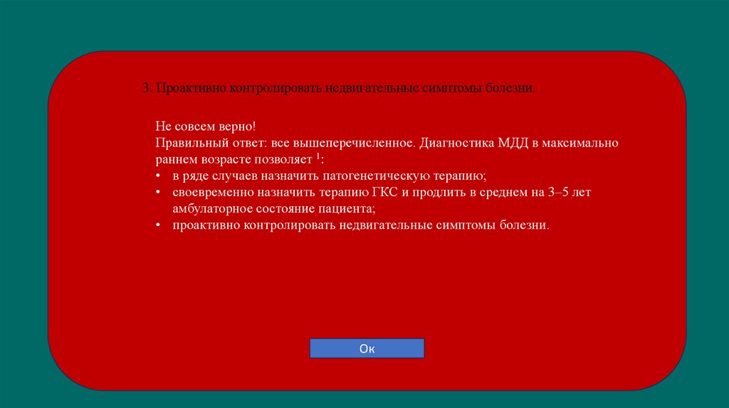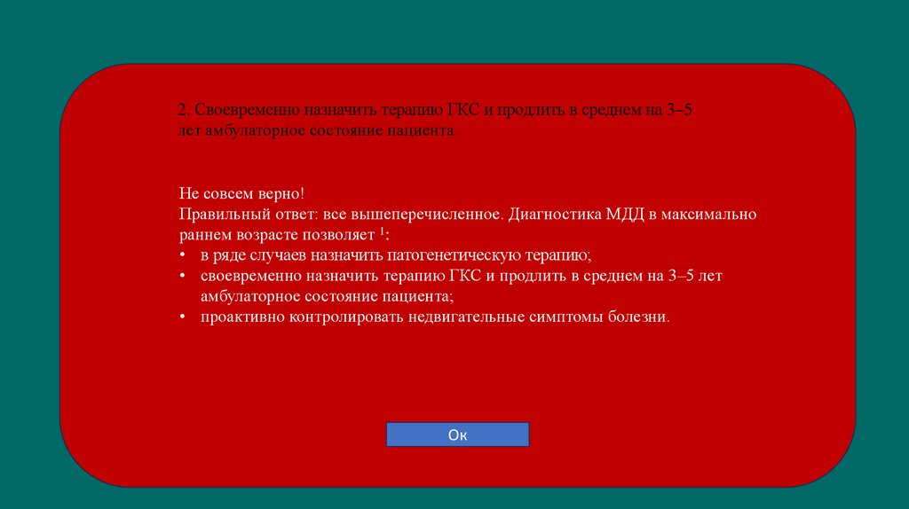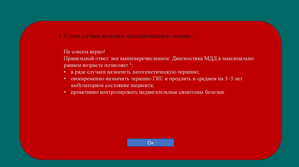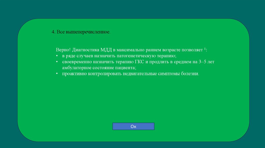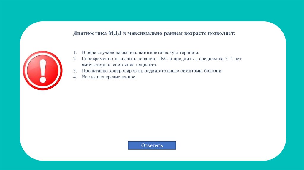 Верно! Диагностика МДД в максимально раннем возрасте позволяет 1: