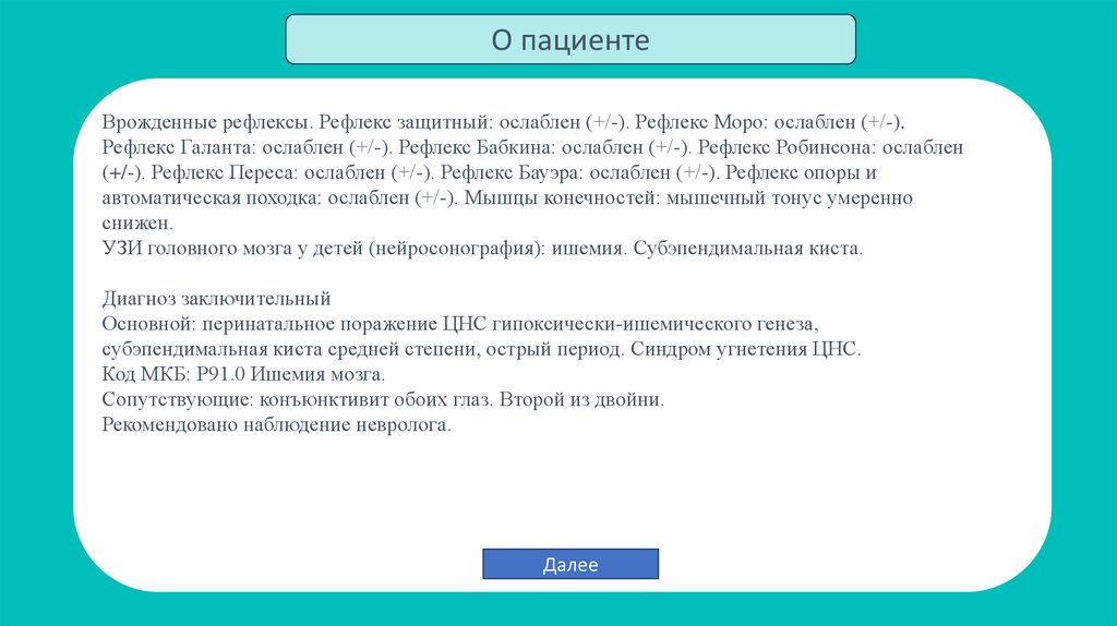 О пациентеВрожденные рефлексы. Рефлекс защитный: ослаблен (+/-). Рефлекс Моро: ослаблен (+/-).