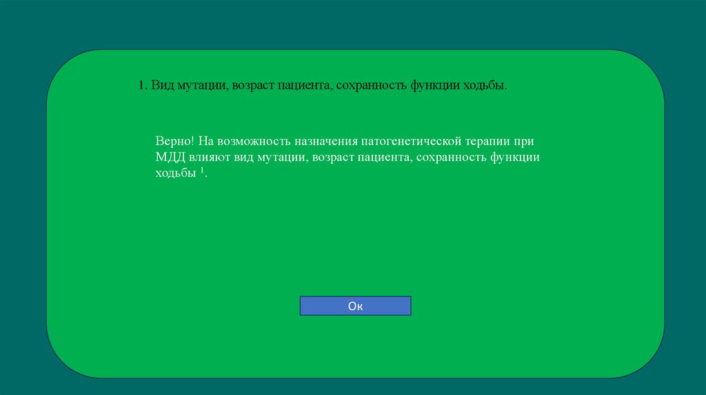 1. Вид мутации, возраст пациента, сохранность функции ходьбы.