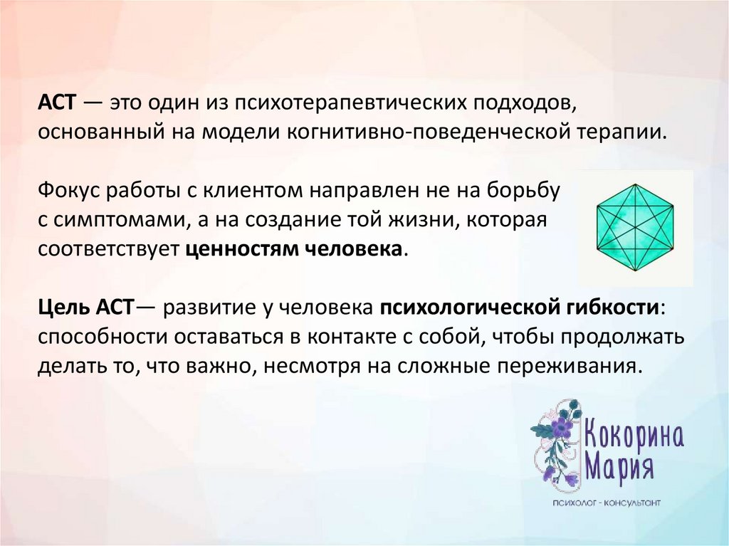 АСТ — это один из психотерапевтических подходов,основанный на модели когнитивно-поведенческой терапии.