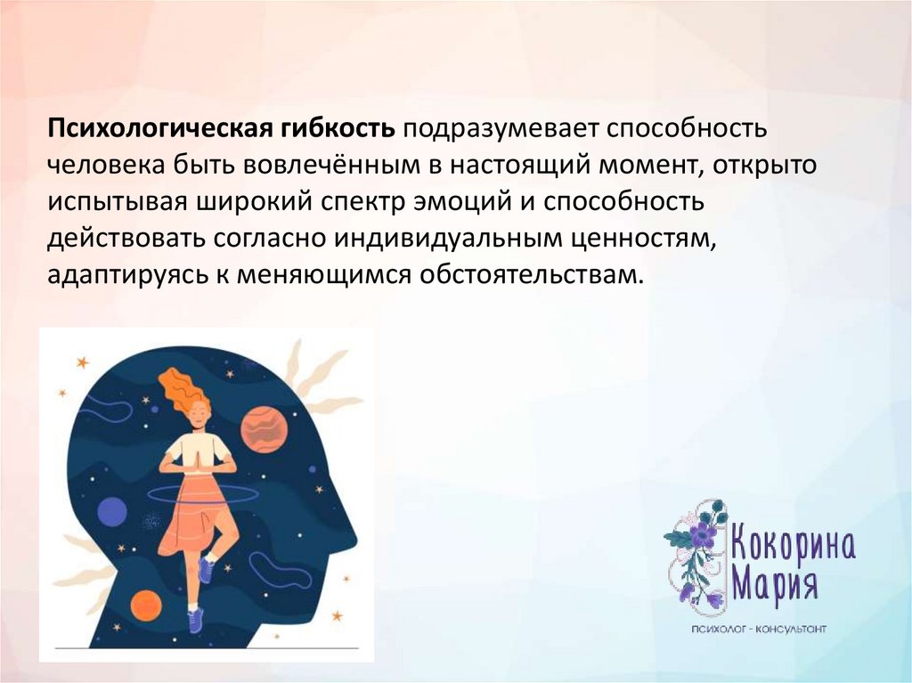 Психологическая гибкость подразумевает способностьчеловека быть вовлечённым в настоящий момент, открыто