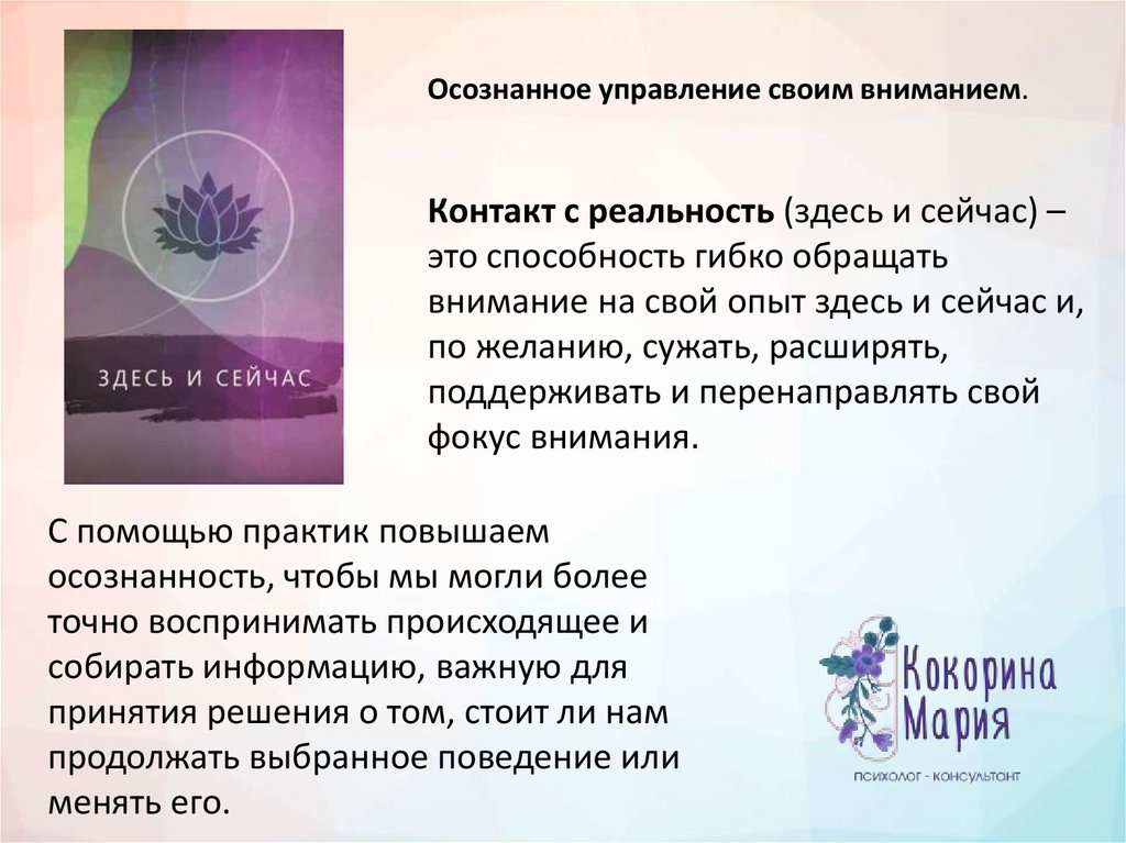 Осознанное управление своим вниманием.Контакт с реальность (здесь и сейчас) –
