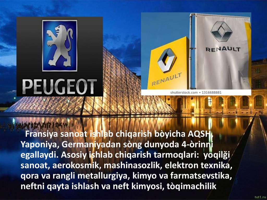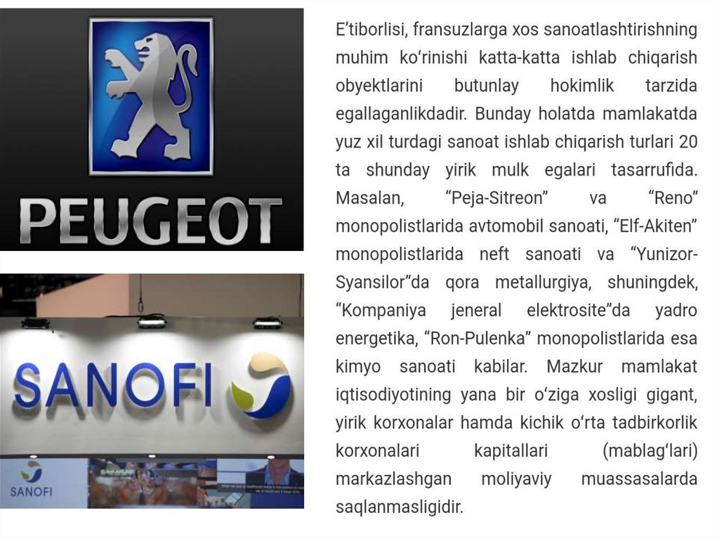 Fransiya sanoat ishlab chiqarish bòyicha AQSH,Yaponiya, Germaniyadan sòng dunyoda 4-òrinni