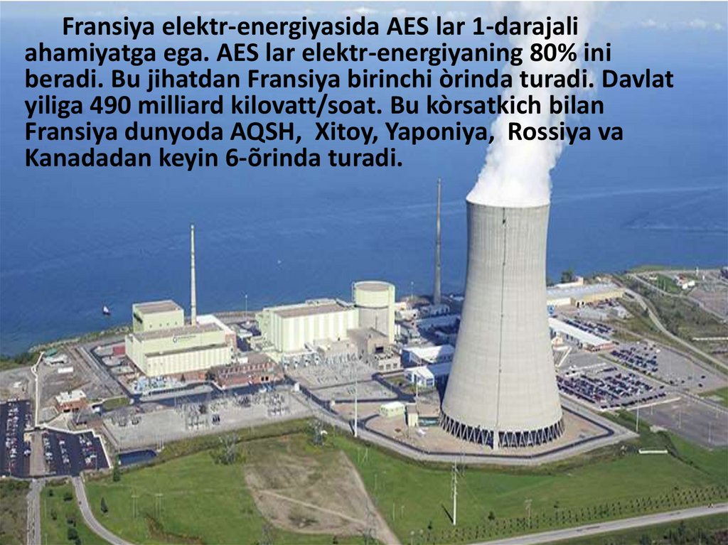 Fransiya elektr-energiyasida AES lar 1-darajaliahamiyatga ega. AES lar elektr-energiyaning 80% ini