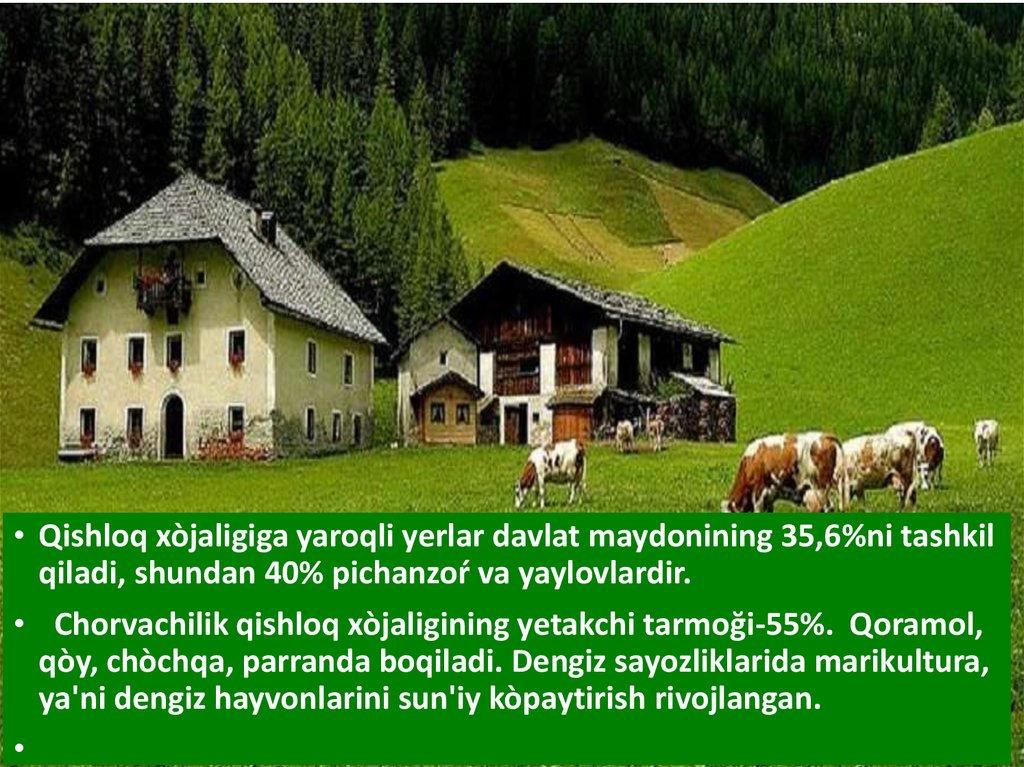 • Qishloq xòjaligiga yaroqli yerlar davlat maydonining 35,6%ni tashkilqiladi, shundan 40% pichanzoŕ va yaylovlardir.