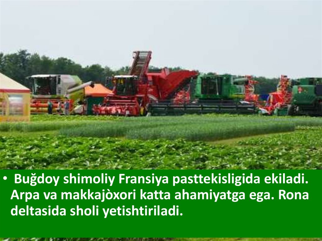 • Buğdoy shimoliy Fransiya pasttekisligida ekiladi.Arpa va makkajòxori katta ahamiyatga ega. Rona