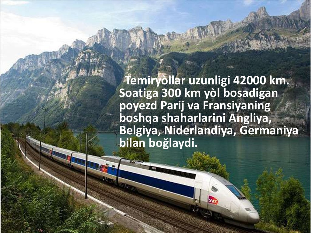 Temiryòllar uzunligi 42000 km.Soatiga 300 km yòl bosadigan