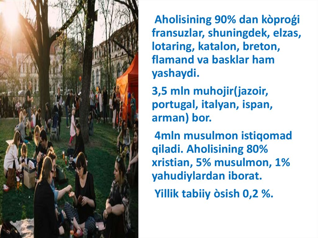 Aholisining 90% dan kòproģifransuzlar, shuningdek, elzas,
