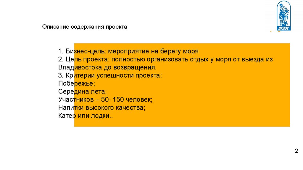 Описание содержания проекта1. Бизнес-цель: мероприятие на берегу моря