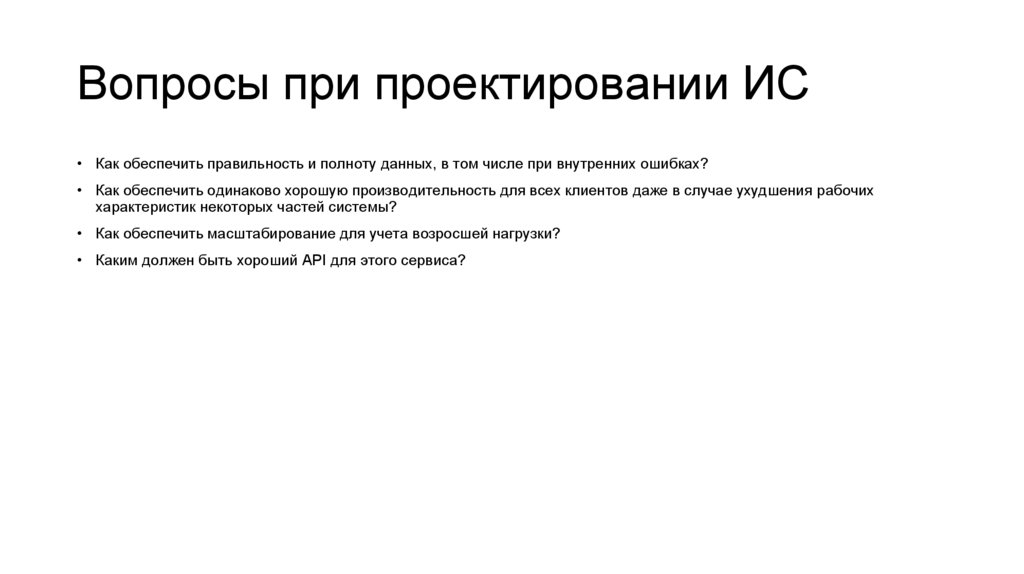 Вопросы при проектировании ИС• Как обеспечить правильность и полноту данных, в том числе при внутренних ошибках?