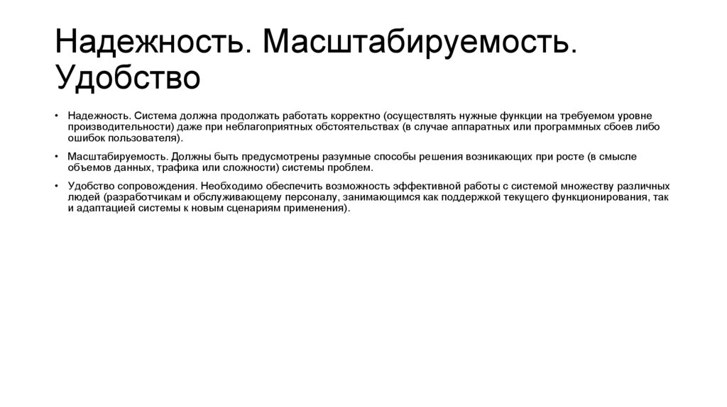 • Надежность. Система должна продолжать работать корректно (осуществлять нужные функции на требуемом уровне