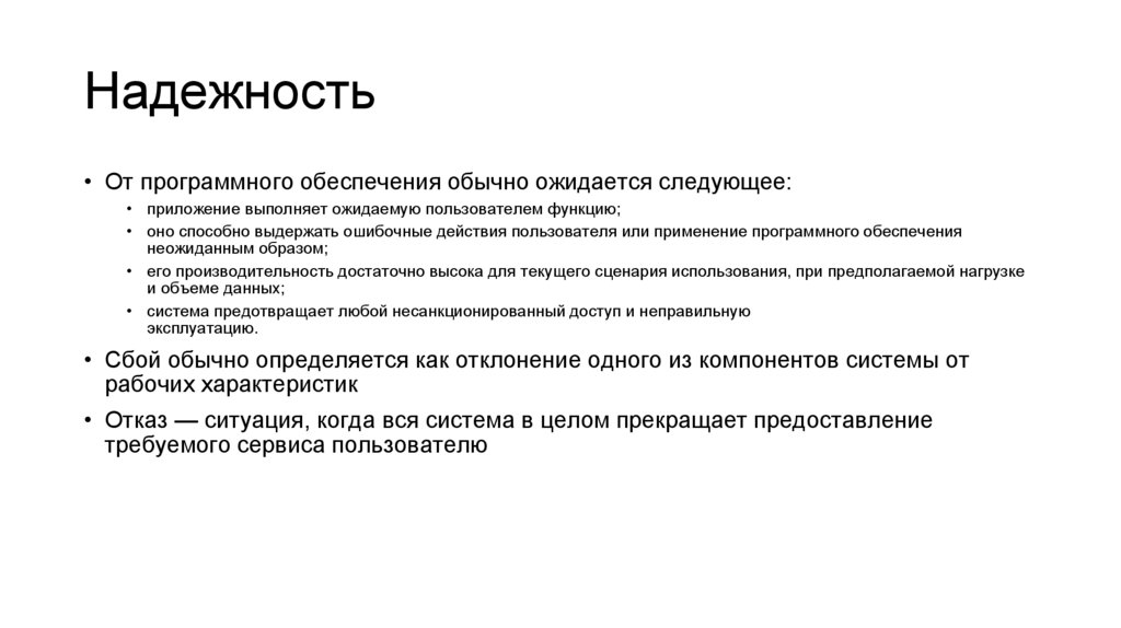 Надежность• От программного обеспечения обычно ожидается следующее: