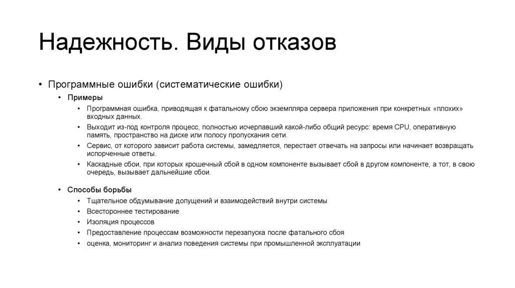 Надежность. Виды отказов• Программные ошибки (систематические ошибки)